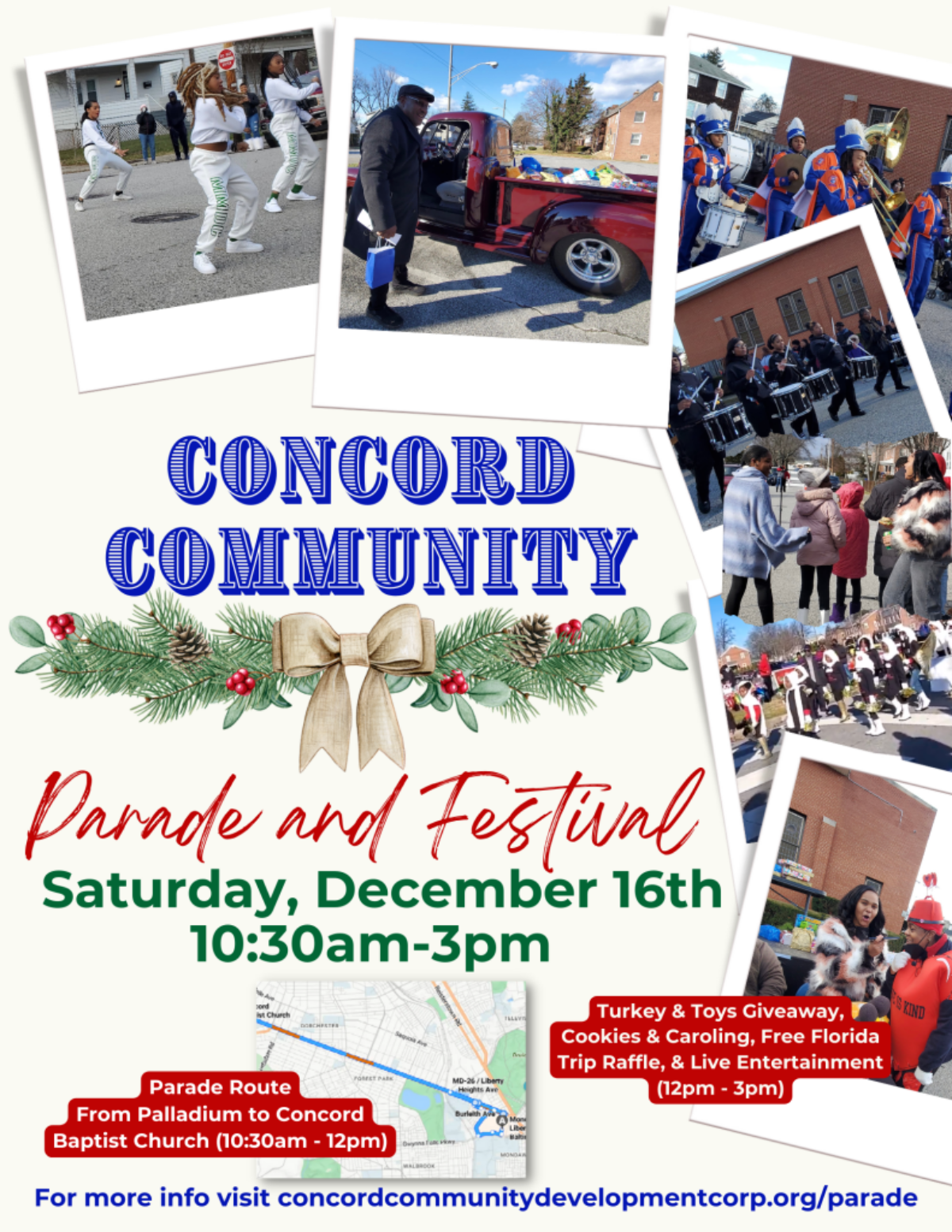 Join us on Saturday, December 16 at 10:30 a.m. as we parade down Liberty Heights Ave. to Concord Baptist Church for holiday festivities, food, fun & entertainment! Let’s bring the community together to engage those of all ages. There will be a turkey giveaway, Santa Clause toy giveaway, ice skating & much more. You do not want to miss this!