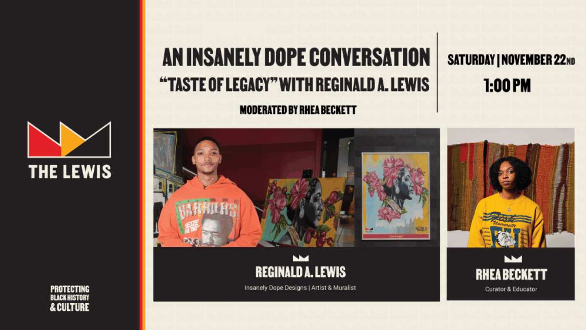 Join the Reginald F. Lewis Museum for an artist conversation on its latest art installation, Taste of Legacy with mixed media artist Reginald A. Lewis, of Insanely Dope Designs and MICA Faculty Staff Rhea Beckett. Taste of Legacy is a vibrant tribute to African American heritage, resilience, and creativity. Reginald will discuss his journey to becoming a self-taught artist and muralist who uses his art to speak to the history and legacy of African American culture.