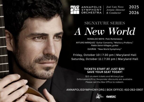 Internationally renowned Spanish guitarist Pablo Sainz-Villegas joins the Annapolis Symphony Orchestra to share his passion for classical guitar with his fellow countryman, Maestro José-Luis Novo. This performance offers a rare opportunity to experience the brilliance of two Spanish-born artists in one unforgettable evening. Contemporary Mexican composer Arturo Márquez’s new guitar concerto, written specifically for Sainz-Villegas himself and subtitled Mystical and Profane, is a virtuosic and emotional work that won’t disappoint.