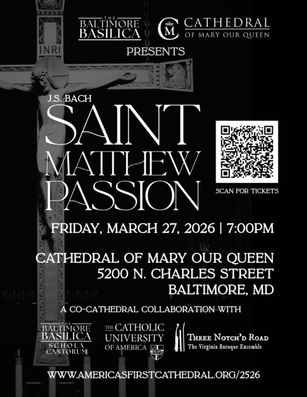 Join us on Friday, March 27th for Bach’s St. Matthew Passion at the Cathedral of Mary Our Queen at 7 PM. Led by Basilica Music Director Samuel Rowe, this special co-cathedral collaboration between the Baltimore Basilica and the Cathedral of Mary Our Queen brings together exceptional musicians from the Basilica Schola Cantorum, Three Notch’d Road Baroque Ensemble, and the Catholic University’s Women’s Choir to perform one of the greatest masterpieces of sacred music ever written.