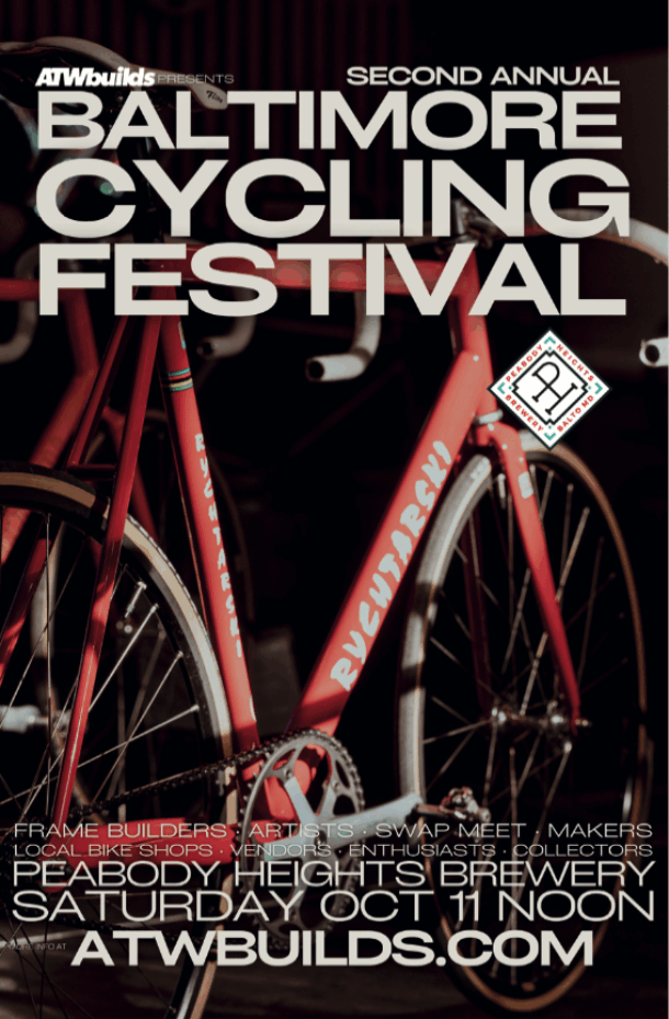 In this latest iteration of an ATW event we’ve decided to turn it into a full blown festival with music, local and regional frame builders, artists, cycling brands and a swap meet all at one location. On October 11th, 2025 we’re hosting the second annual Baltimore Cycling Festival at Peabody Heights Brewery.