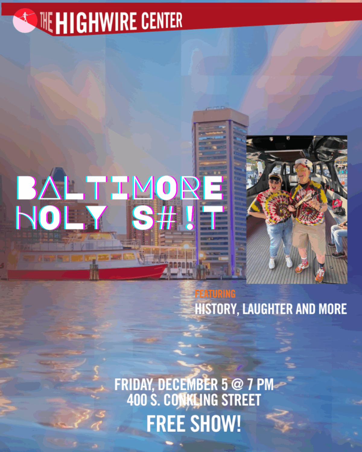 Laughter takes center stage at Highwire Improv with Baltimore Holy S#!t during Highlandtown’s First Friday Art Walk. The hilarious voyage around Baltimore’s iconic waterways comes inside and to the streets of Highlandtown to explore Baltimore’s weird history, unusual landmarks, most ridiculous people and the best stories Charm City has to offer.