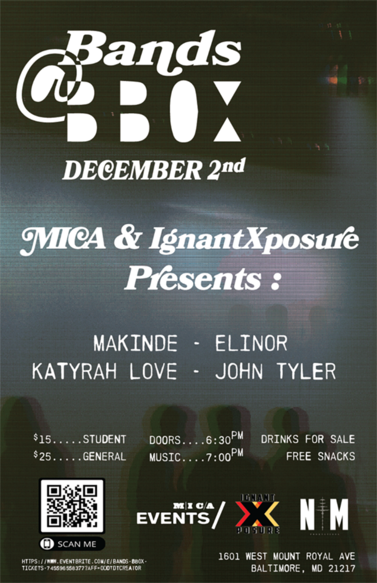 Join us at MICA’s black box theatre, BBOX, for a night of performances by Ignant Exposure, Makinde, Elinor, Katyrah Love and John Tyler.