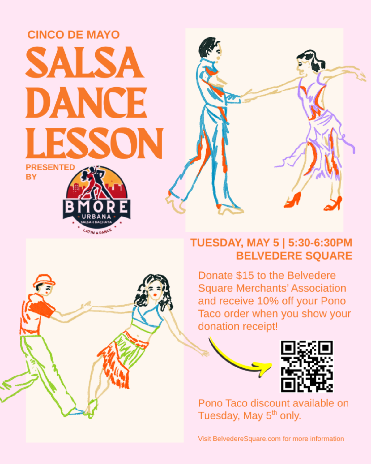 Spice up Cinco De Mayo with a Salsa dance lesson with Bmore Urbana from 5:30- 6:30 p.m. on Tuesday, May 5 at Belvedere Square!