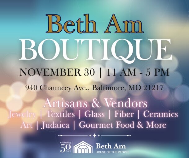 Welcome to Beth Am’s first-of-its-kind holiday boutique featuring amazing artisans, jewelry, pottery, textiles, fiber, glass, woodworking, Judaica, gourmet food, unique gifts and more! Located at the corner of Eutaw Place and Chauncey Avenue.