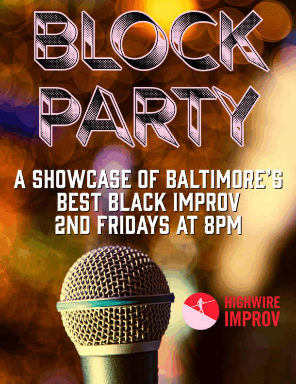 Presented by Highwire Improv, Block Party is 90 minutes of the funniest improv in Baltimore and a true showcase of Baltimore’s best Black improv comedians!