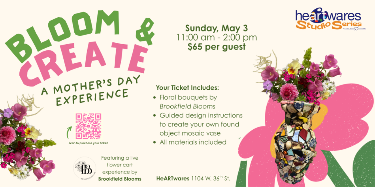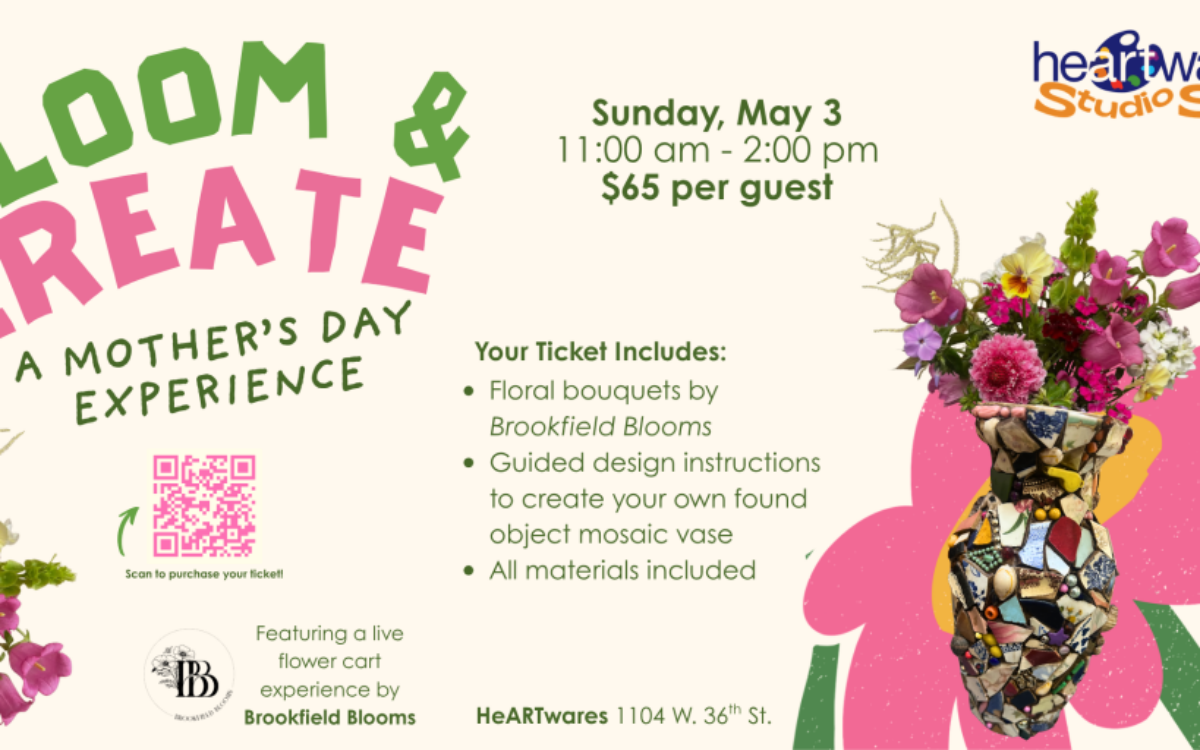 Participants will decorate a custom keepsake mosaic vase with found objects and ceramics, and fill it with a bouquet of fresh, locally grown flowers from Brookfield Blooms. Each finished vase is intended to be elegant, enduring and worthy of display. This unique keepsake can be refilled and enjoyed long after Mother’s Day 2026.