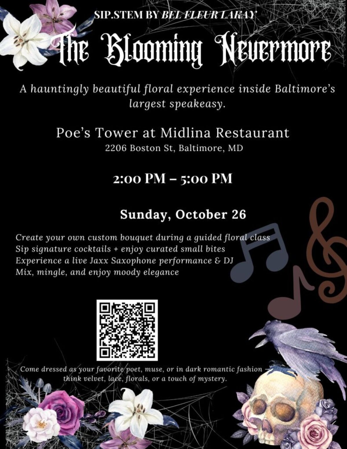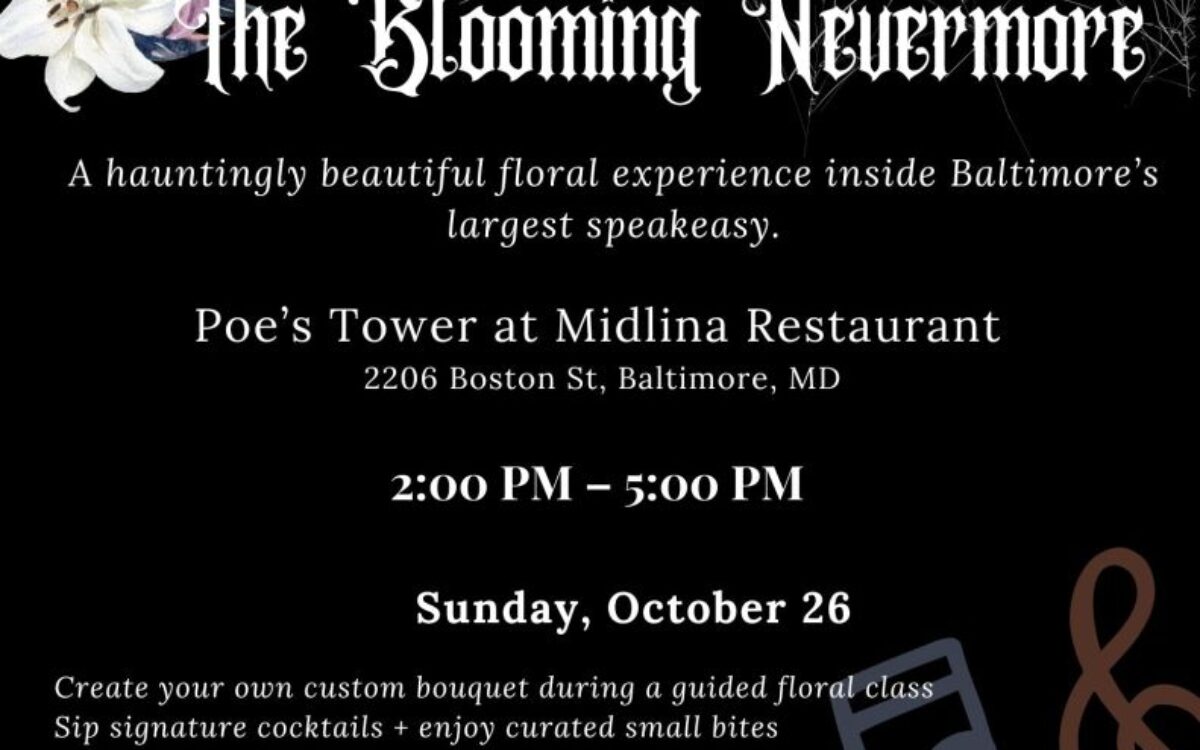 Step inside Baltimore’s largest speakeasy, Poe’s Tower, for The Blooming Nevermore a hauntingly beautiful afternoon of floral design, cocktails and live music.