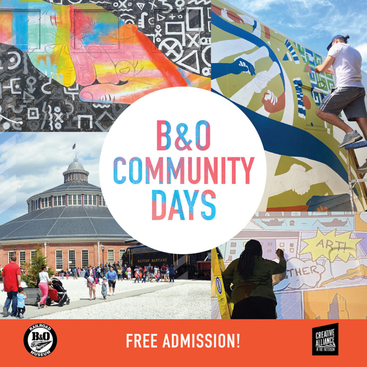 The focus of our B&O Community Days is the B&O Street Art Project, which selected local four street artists to design murals on the theme of connectedness and paint them onto a caboose here at the Museum. During the first Community Day on Sat, June 19, were proudly unveiling the results of our Street Art Project with an art exhibit reception, and on Sundays, July 18 & August 8, visitors will get to attend Artist Talks to hear from the artists about the process of designing and creating these incredible works of art.