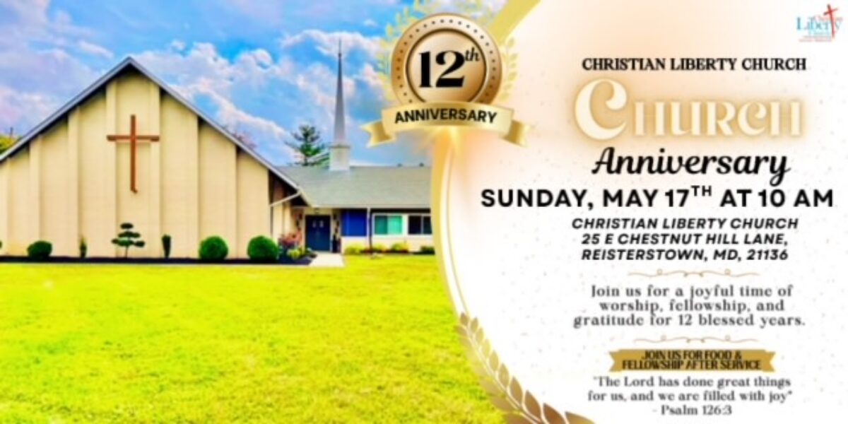 PRAISE THE LORD JESUS! Join us for CHRISTIAN LIBERTY CHURCH’s 12th ANNIVERSARY, SUNDAY, MAY 17, 2026 @10 a.m.! After 10 a.m. service, celebrate with Food, kids’ games and more! Church Location – 25 E. Chestnut Hill Ln., Reisterstown, MD 21136. For more information, contact 410-523-5683 or visit www.christianlibertychurch.org or https://www.facebook.com/christianlibertychurch/