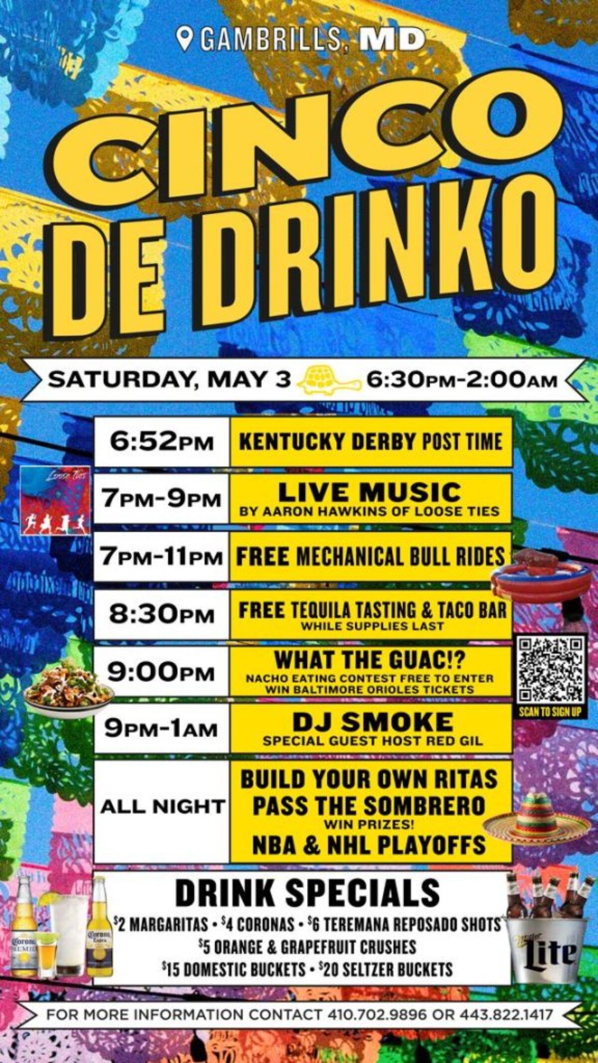 The Greene Turtle invites you to Cinco de Drinko at their Gambrills location this Saturday, May 3rd to kick off Cinco de Mayo celebrations! They’re celebrating with hourly activities starting at 6:30 pm until 2:00 am, yes, they know how to throw a party! Starting off with Live Music by local artist, a mechanical bull, tequila tastings, discounted drinks all evening long + a chance to win tickets to the NBA & NHL playoffs, and DJ Smoke to keep the energy up through late night!