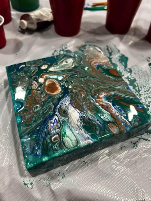Join local abstract artist, Tara Gillespie, for an introduction to fluid art! Cocktails & Canvas is a relaxed BYOB acrylic pouring class. During this fun time together we will be covering several pouring techniques, I will be sharing my paint recipes, and you will create two, different fluid art pieces – a 12×12 puddle pour piece and a 6×6 dirty flip cup pour piece. To finish your art works I clean and varnish them personally. You may choose between a gloss varnish or opt for an epoxy resin.