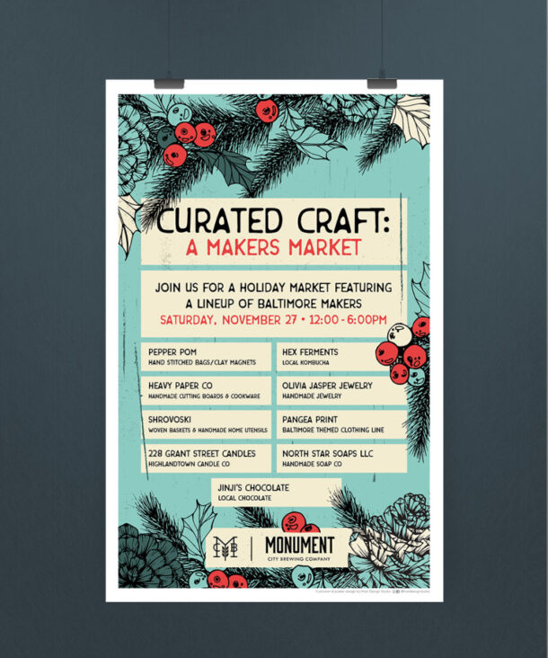 We will be featuring a lineup of Baltimore makers including Paper Pom, Hex Ferments, Heavy Paper Co, Olivia Jasper Jewelry, Shrovoski, Pangea Print, 228 Grant Street Candles, North Star Soaps LLC and Jinjis Chocolate.