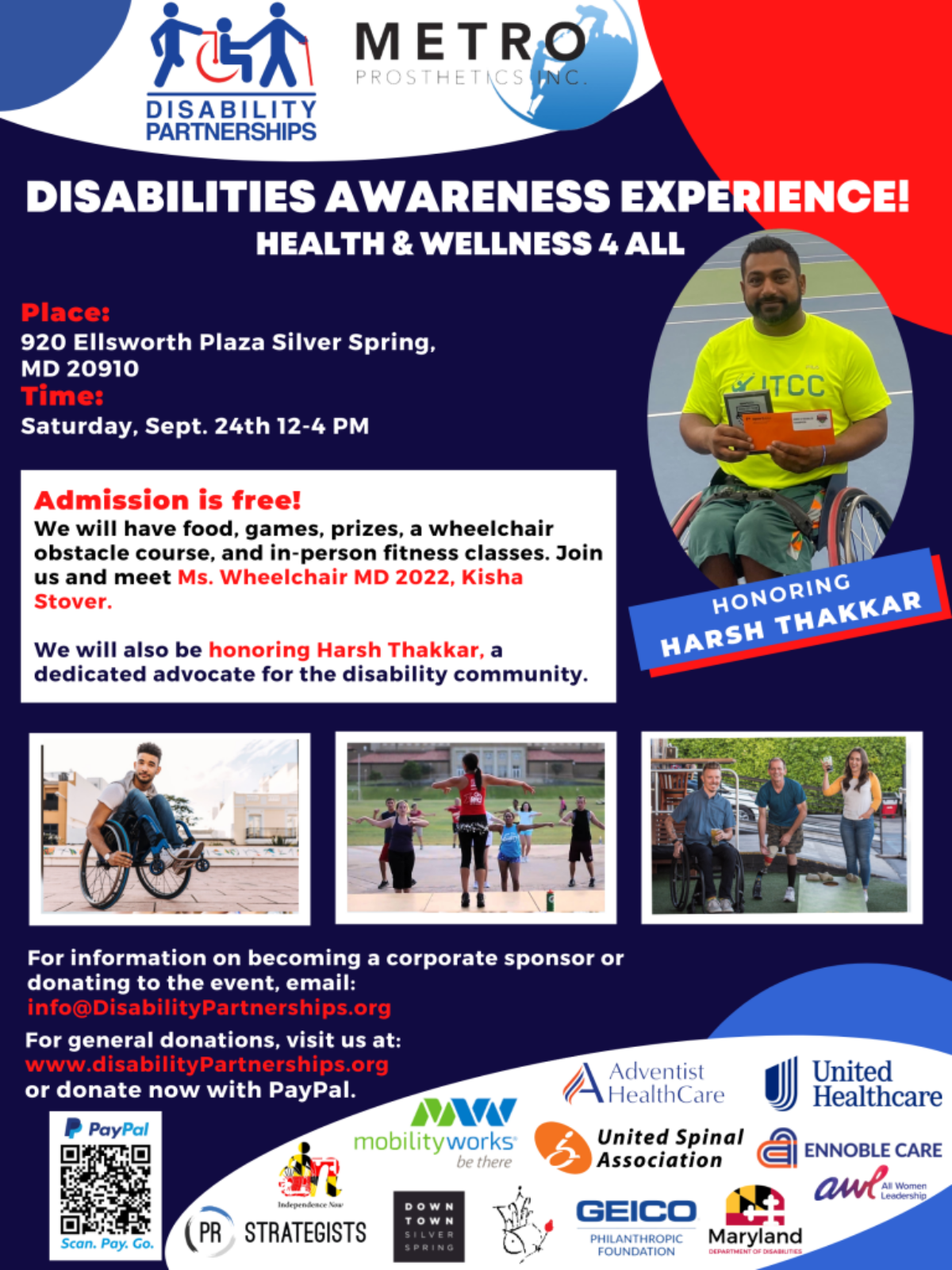 On Saturday, September 24, 2022, Disability Partnerships will host the Disability Awareness Experience: A Health and Wellness Expo. The event will be located in Ellsworth Plaza, Downtown Silver Spring from 12-4 p.m. We will feature activities such as a wheelchair obstacle course, a DJ, games, prizes for all ages, a photo booth with an adorable service dog, raffles and much more. Disability Partnerships is a community-based 501c3 organization with a mission to improve the quality of life for individuals living with a physical disability.