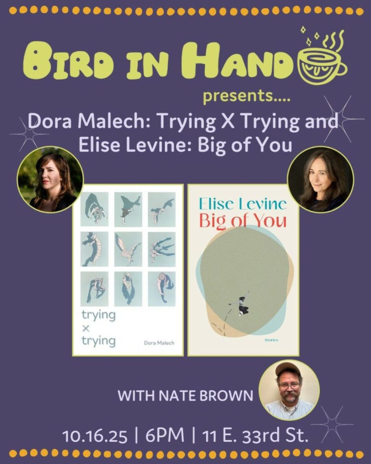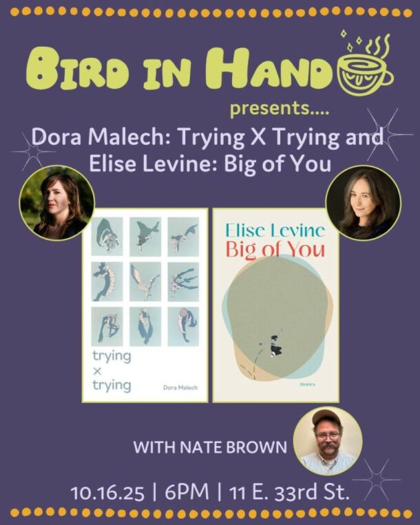 Join us at Bird in Hand for a special joint book launch for Dora Malech’s new poetry collection, Trying X Trying, and Elise Levine’s new short story collection, Big of You!