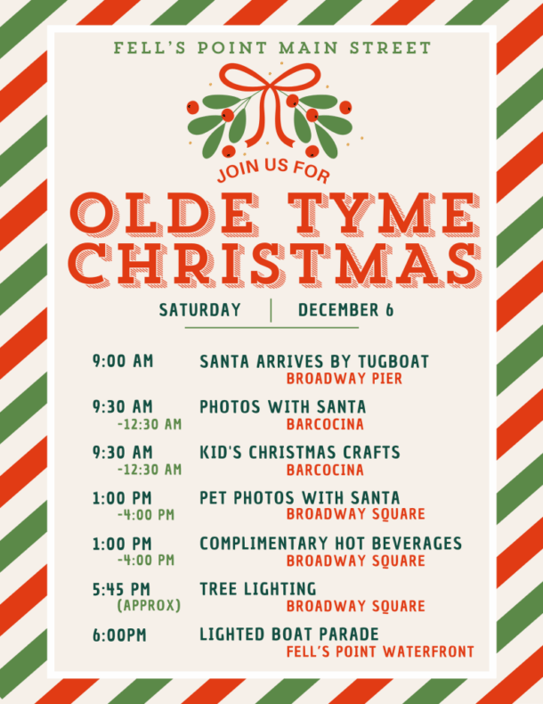 We are kicking off the holiday season in Fell’s Point on Saturday, Dec. 6 with Olde Tyme Christmas. The day starts off with Santa arriving on a tugboat at Broadway Pier to fill the day with holiday cheer. Photos with Santa, kids crafts, letters to Santa, the lighting of the Christmas Tree and a view of the Lighted Boat Parade make for a fun Fell’s Point day for the whole family. Stroll the streets and pop into our local retailers for holiday gifts, sip on a warm cocktail in one of our historic bars and enjoy a meal with family and friends at any of our award winning restaurants.