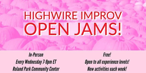 This will be a low-stress jam experience for improvisers of all levels! We’ll do introductions, a boundaries check-in, some fun improv warmups to get the mind and body ready, and then we’ll do a range of improv exercises, games, and some long-form sets! The jam will run from 7-9 p.m.