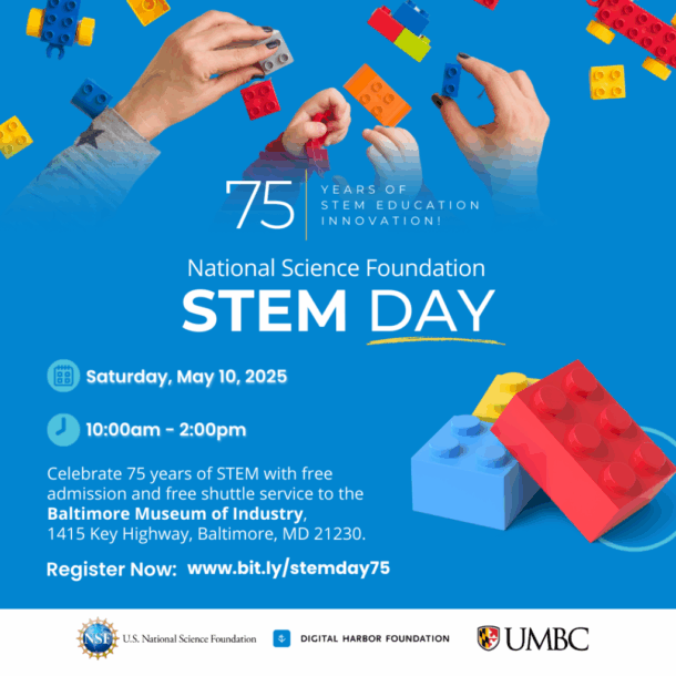 In celebration of the National Science Foundation’s 75th anniversary, Digital Harbor Foundation and the University of Maryland, Baltimore County (UMBC) will host a NSF STEM Day on Saturday, May 10, 2025, from 10 a.m. to 2 p.m. at the Baltimore Museum of Industry (1415 Key Highway, Baltimore, MD 21230).