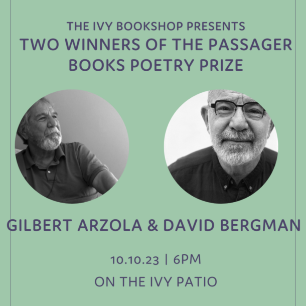 Join The Ivy Bookshop for an evening to celebrate two winners of the poetry prize from Baltimore’s own Passager Books: Gilbert Arzola (2019) and David Bergman (2022)!