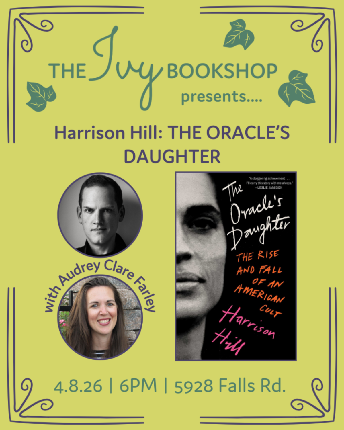 Join us on the Ivy patio to hear from Harrison Hill and Audrey Clare Farley as they discuss Hill’s new book, The Oracle’s Daughter! This gripping chronicle of the rise and fall of a woman-led cult traces the fascinating beginnings and violent end of ACMTC, but also extends to the broader history of extremism in America.