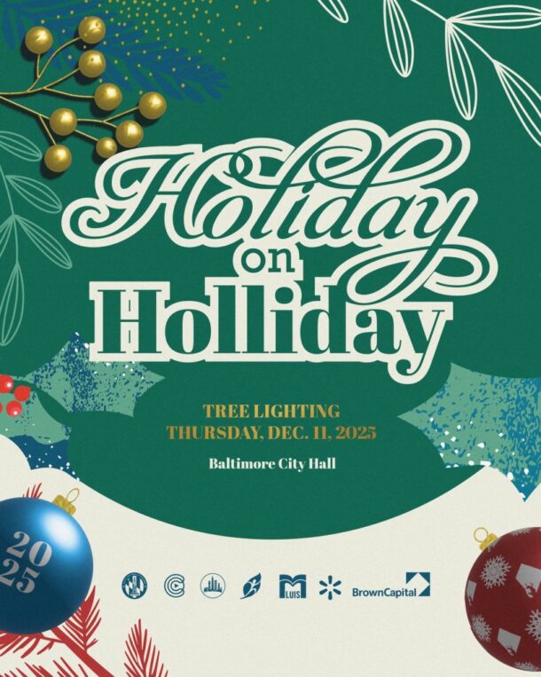 The Baltimore City Hall Christmas Tree will be all aglow in lights at the annual tree lighting that kicks off the “Holiday on Holliday” on Dec. 11.