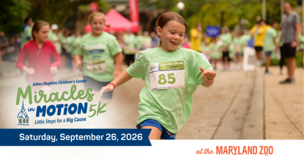 Join us, Saturday, September 26, 2026, for the third annual Johns Hopkins Children’s Center Miracles in Motion 5K and 1-mile walk!