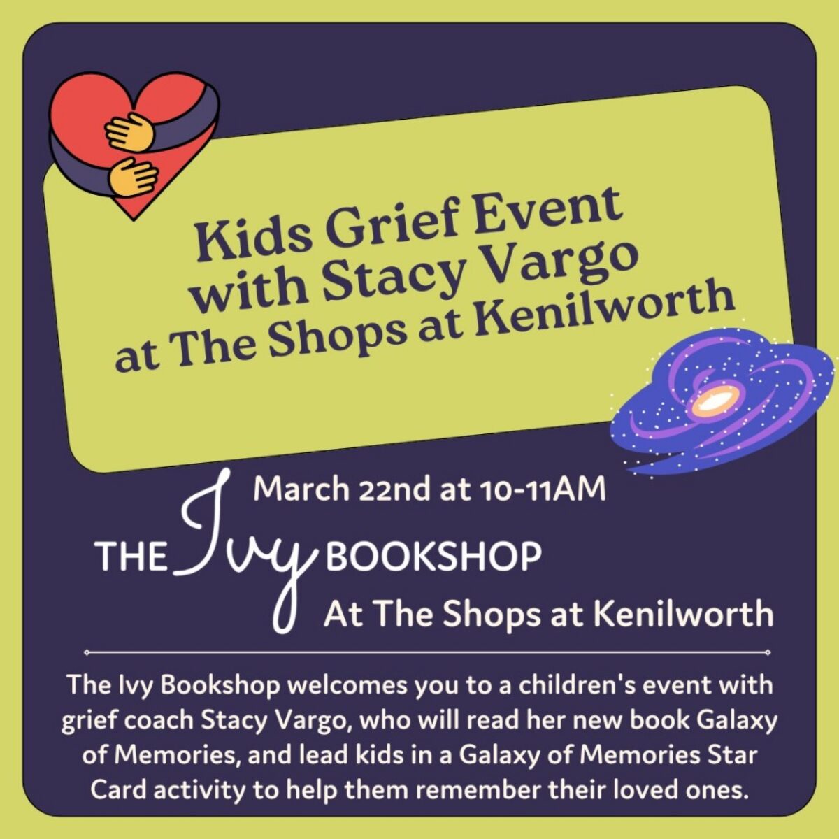 The Ivy Bookshop at The Shops at Kenilworth welcomes you to a children’s event with grief coach Stacy Vargo, who will read her new book Galaxy of Memories, and lead kids in a Galaxy of Memories Star Card activity to help them remember their loved ones.