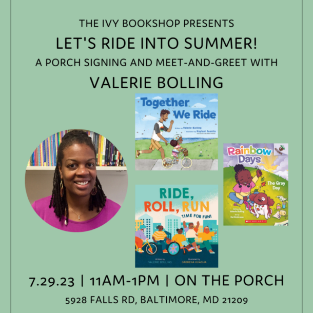 Join The Ivy in welcoming children’s author Valerie Bolling for “Let’s Ride Into Summer!” , a signing and meet-and-greet on our front porch! Bring the whole family for summer activities or swing by to find a signed copy for the child in your life.