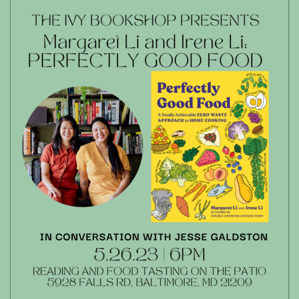 The Ivy is delighted to host an evening with Irene Li and Margaret Li in celebration of their newest cookbook, PERFECTLY GOOD FOOD! Jesse Galdston of FireFly Farms Market in Baltimore’s Whitehall Market will join Irene and Margaret in conversation.