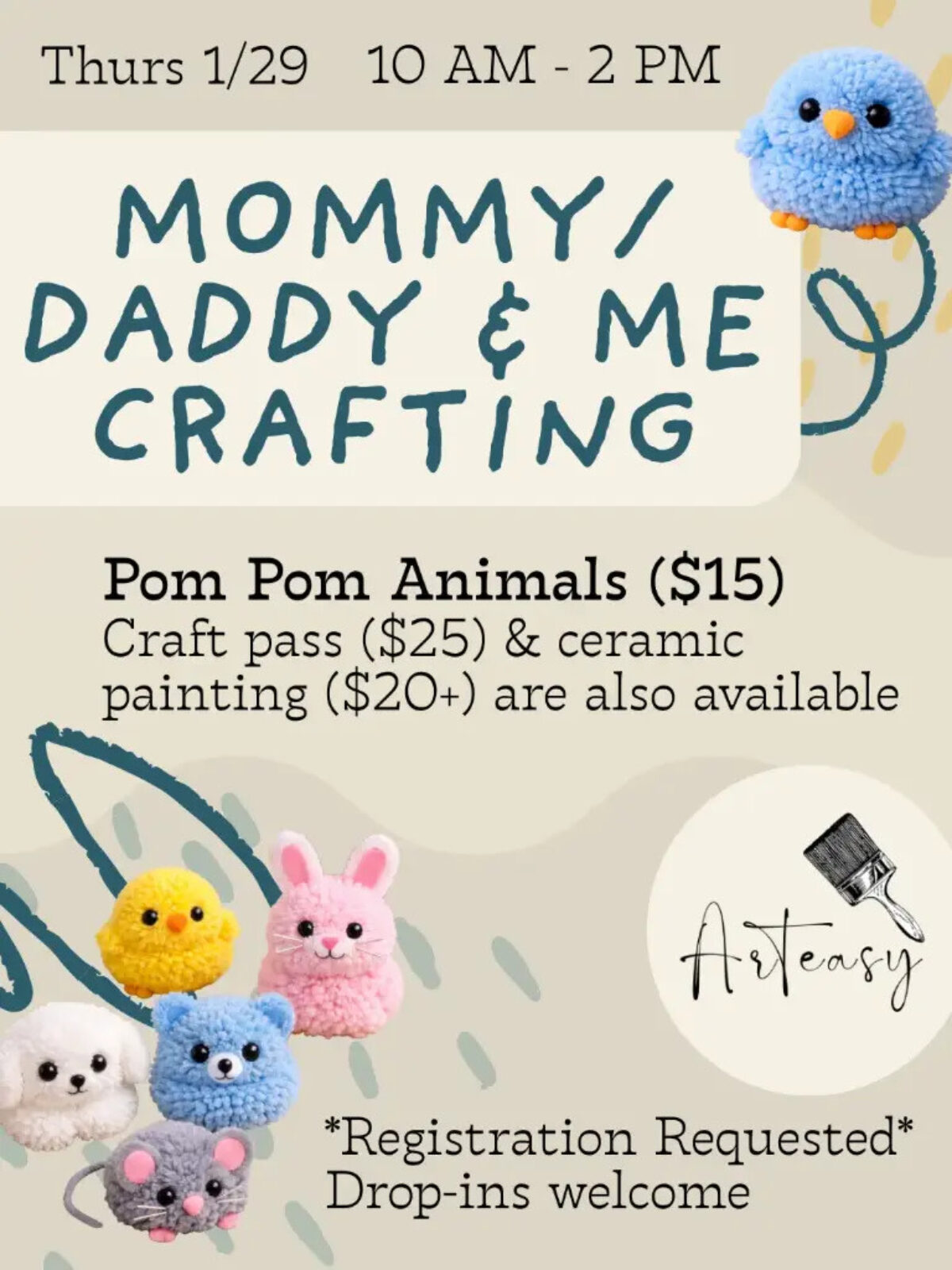 Come in for some cozy, family-friendly crafting to celebrate and share some creative energy! We’ve designed a fun day for families with instructor-led crafts. Age range: Crafts are designed for parents and kids to do together. We’d suggest 5+ years can have one parent working with up-to two kids, then between two and five years, we’d suggest a 1:1 parent-to-kid pairing. We have a set craft with prepared materials and guided instruction: pom pom animals! You can make one animal for $15, which includes materials and instructions. Sign-ups are requested to help us with planning. Drop-ins are welcome, of course! You can also drop in any time for a craft pass ($25), which includes open access to our art studio materials or to paint a ceramic (starting at $20) from 10-2 PM.