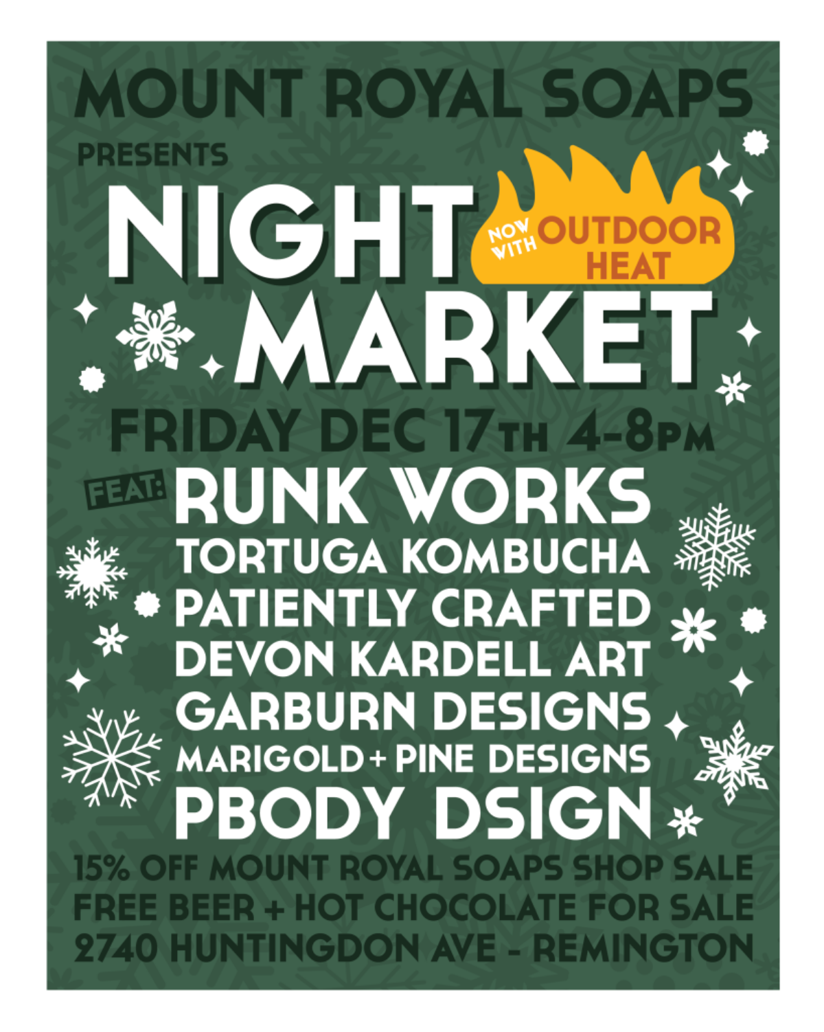 Free holiday night market with 15% off all day! Outdoor heating and awesome local vendors! Get your last minute shopping done in one spot!