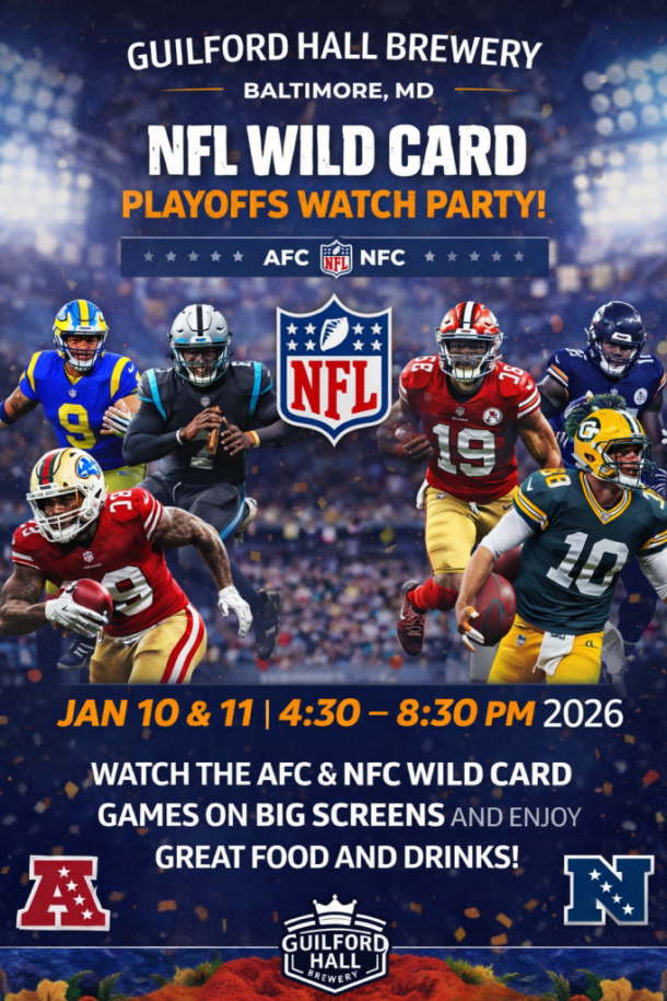 Kick off the NFL Playoffs with us at Guilford Hall Brewery! Join us January 10 & 11, 2026 from 4:308:30 PM to watch the AFC & NFC Wild Card games on big screens. Enjoy great food, craft beer and a high-energy game-day atmosphere all weekend long.