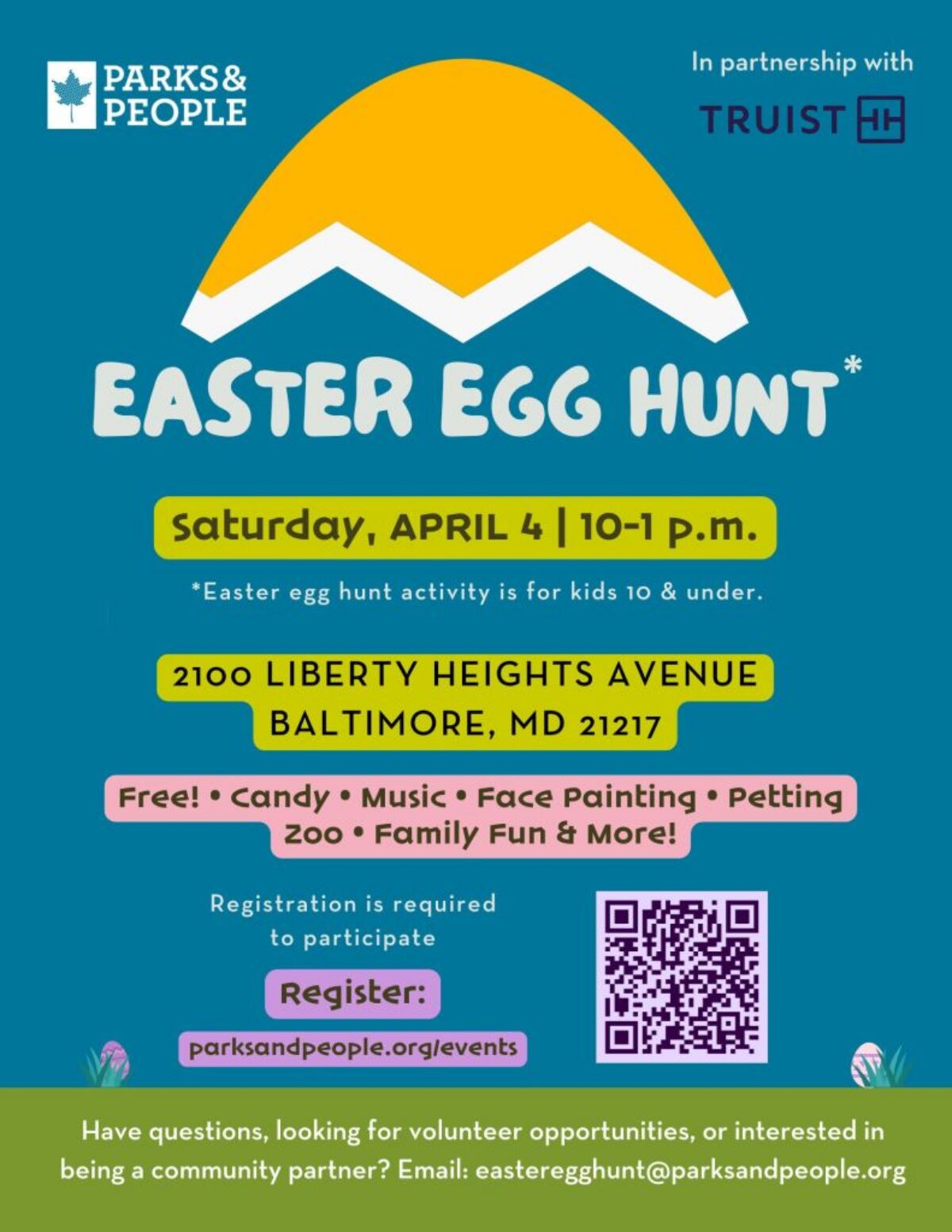 Join Parks & People for our annual Easter event! Saturday, April 4, 2026, on our beautiful 9-acre campus located at 2100 Liberty Heights Avenue. It’s a day of family thrills filled with children playing, laughing, and discovering Parks & People’s green campus (and thousands of colorful eggs)!