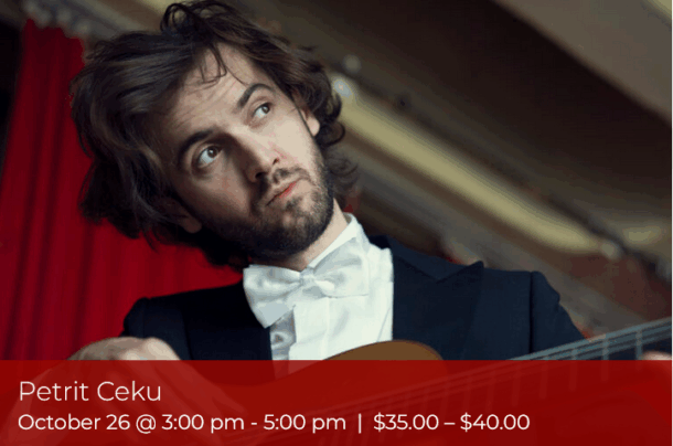 Petrit Çeku’s exquisite sensibility and expressiveness have attracted and engaged audiences worldwide. He has performed recitals throughout the world and has been a soloist with symphonic orchestras such as the Baltimore Symphony Orchestra, Calgary Philharmonic, Czech Chamber Philharmonic, Daejeon Philharmonic, State Hermitage Orchestra of St. Petersburg, Pannon Philharmonic and Zagreb Philharmonic. He collaborates regularly with The Zagreb Soloists and is a founding member of Guitar Trio Elogio. Born in Prizren, Kosovo, Çeku lives in Zagreb, Croatia and graduated at the Zagreb Academy of Music in the class of Darko Petrinjak and at the Peabody Institute in the class of Manuel Barrueco. Petrit Çeku teaches Chamber Music for Guitar at The University of Music and Performing Arts in Graz, Austria. Hailed by Calgary Herald as an effortless player, with a strong, projecting sound, Çeku is the first prize winner of many international guitar competitions, including Parkening (Malibu, USA), Schadt (Allentown, USA), Biasini (Bologna, Italy), and Pittaluga (Alessandria, Italy). His recordings have been released by BuntArt, Cantus, Croatia Records, Naxos and Eudora Records. Çeku’s album The Cello Suites, which includes all six cello suites by J.S Bach was nominated for ICMA Awards. Recording sessions for this album were the subject of documentary film Sarabande’ by the award-winning director Kaltrina Krasniqi. Continuing the collaboration with the filmmaker, Petrit Çeku later composed the original score for her feature film Vera Dreams of the Sea,’ which premiered at the Venice Film Festival 2021.
