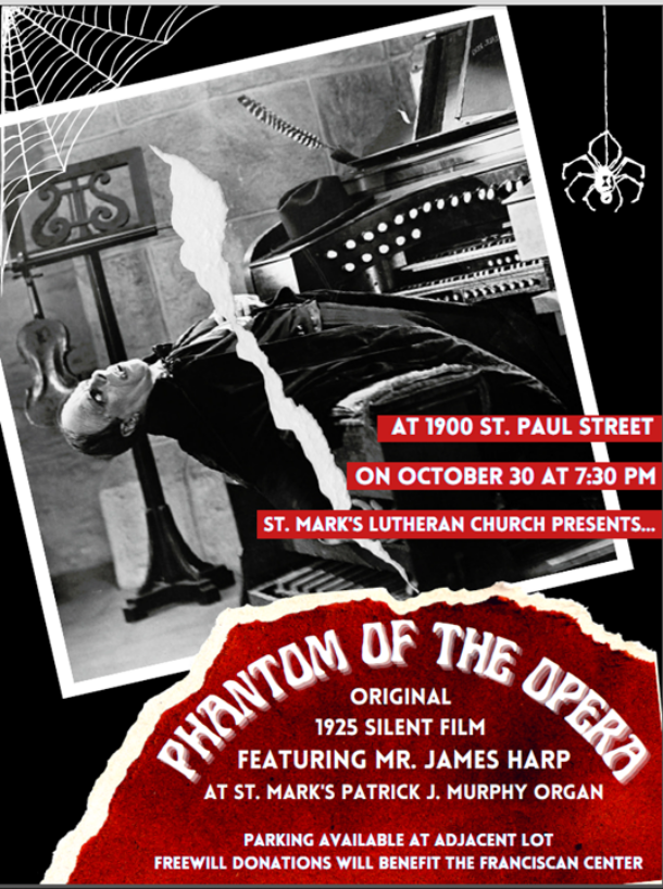 This Halloweekend, the dramatic sanctuary at St. Marks Lutheran Church will play host to a screening of the *original* 1925 silent film version of the Phantom of the Operacomplete with live organ accompaniment by the congregations cantor and esteemed director of the Maryland Opera, Mr. James Harp!
