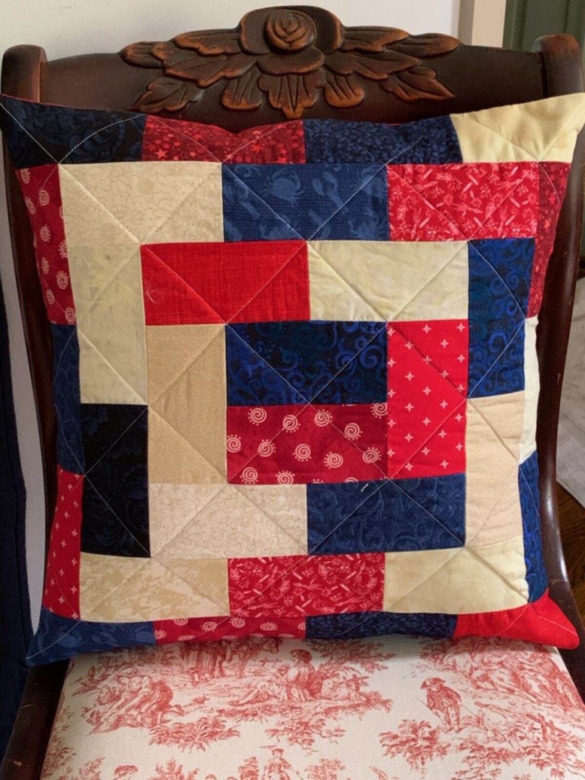 The kit will include pre-cut “Potato Chips” (fabrics may vary), fabric for backing and pillow back, and batting. Instructions for the block and completing a pillow.