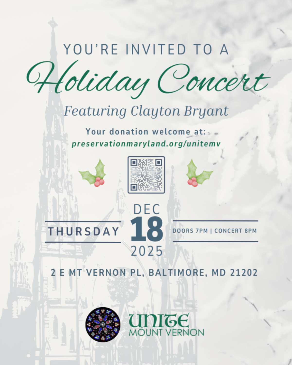The Season of Wonder Holiday Concert is the first offering from the newly-formed UNITE Mount Vernon, which acquired the iconic Mount Vernon Place Church in July 2025. UNITE’s mission is two-fold: to preserve and restore the distinctive architecture of the Church and to play a vibrant role in Mount VernonBaltimore’s historic heart.