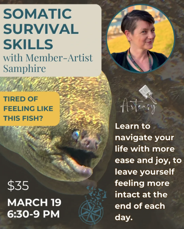 Member-Artist Samphire will lead a Somatic Survival Skills Class on March 19 from 6:30-9 PM.