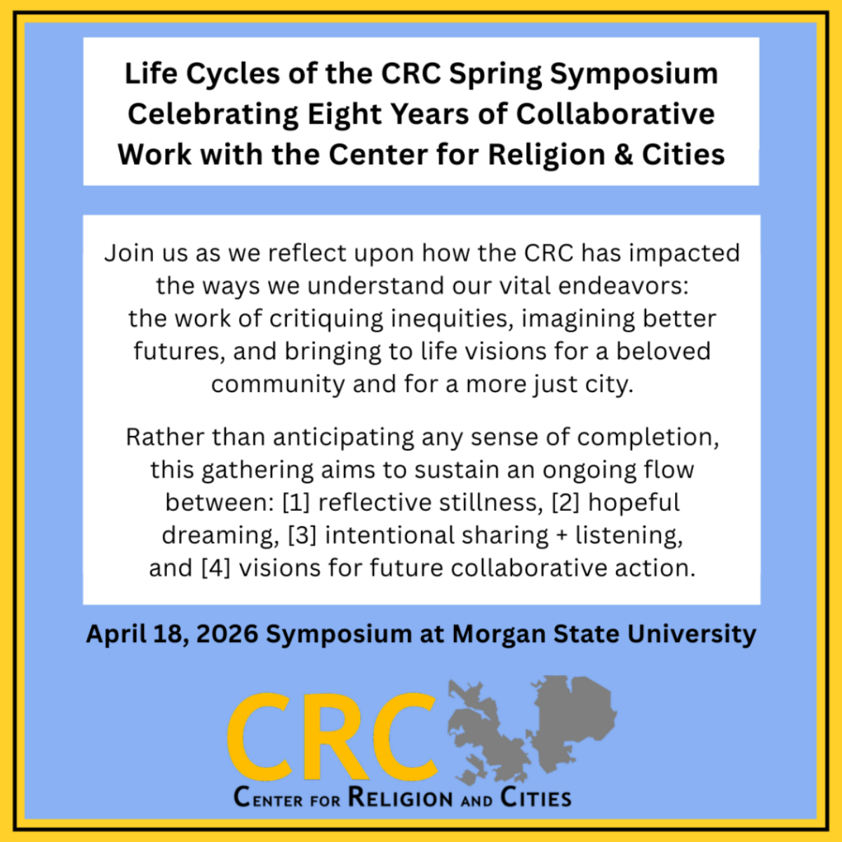 The Center for Religion and Cities (CRC) was founded in 2018 as a group of researchers, students, community leaders, and other partners dedicated to cultivating an ecological understanding of pressing issues related to religion and cities. After eight years of collaborative inquiry, we invite all who have been involved in CRC activities over the years to join us this coming spring. Guided by lessons learned, this symposium provides a space to collectively explore how the quality of our lives and labor improve through the relational and iterative ways we move through change. In this spirit, we will reflect upon how the CRC has impacted the ways we understand our vital endeavors the work of critiquing inequities, imagining better futures, and bringing to life visions for a beloved community for a more just city. Rather than anticipating any sense of completion, this gathering aims to sustain an ongoing flow between: [1] reflective stillness, [2] hopeful dreaming, [3] intentional sharing+listening, and [4] visions for future collaborative action.