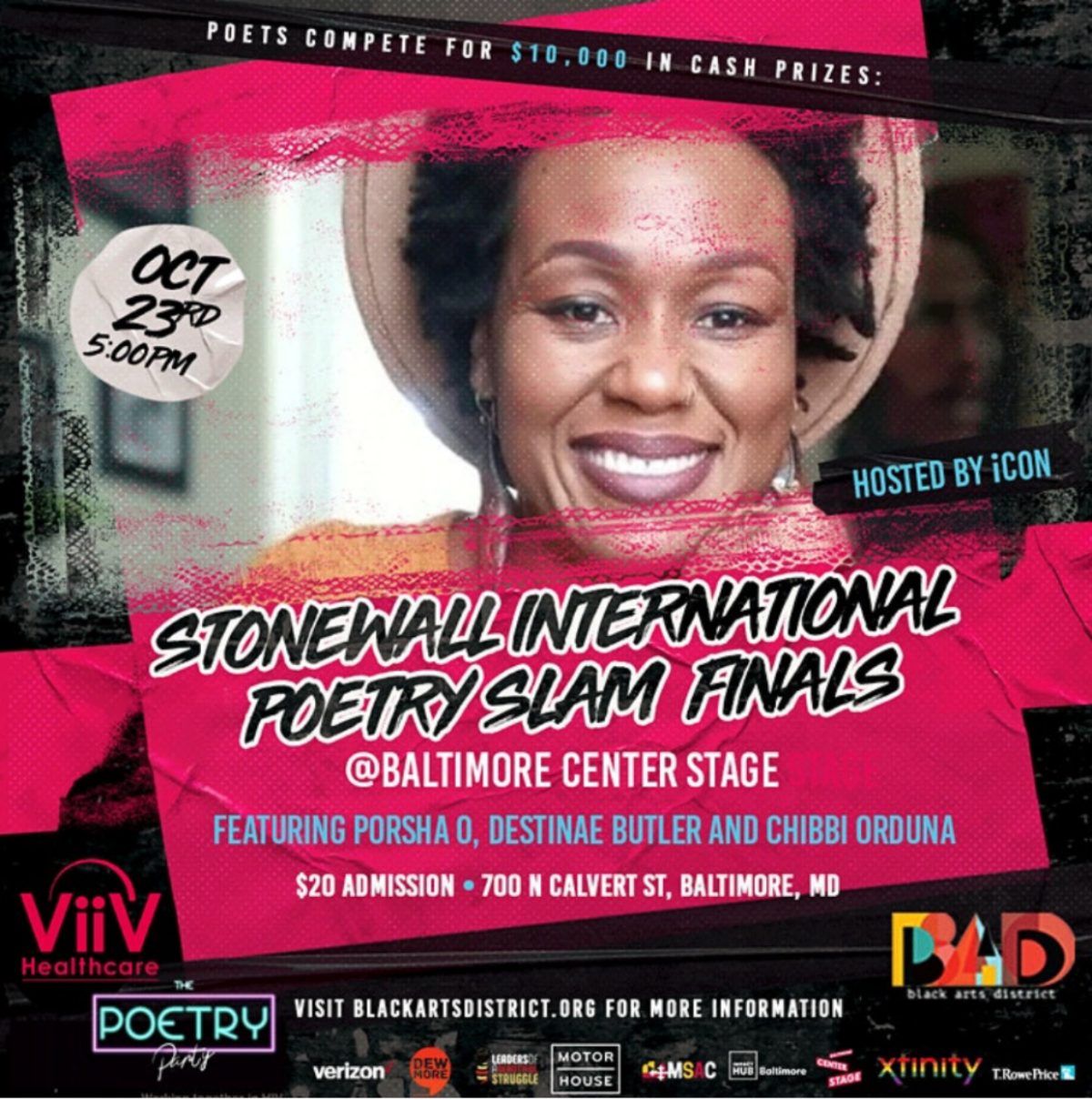 One of the Worlds Biggest Poetry Slams. The Top 10 poets from the Stonewall International Poetry Slam will be competing for $10,000 in cash prizes at Baltimore Center Stage. Hosted by iCon with special performances from Gayle Danley, Porsha O, and Chibbi Orduna