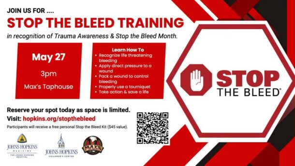 Max’s Taphouse is proud to host the Johns Hopkins Adult Trauma & Pediatric Trauma Services teams on May 27th for a Stop The Bleed course.