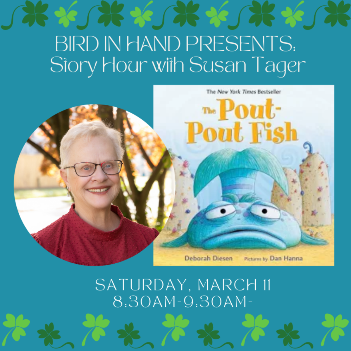 The Ivy Bookshop and Bird in Hand are excited to welcome back Susan Tager for story hour. Let Susan entertain the little ones with stories, songs and a Saint Patrick’s Day craft. We hope you’ll come by!
