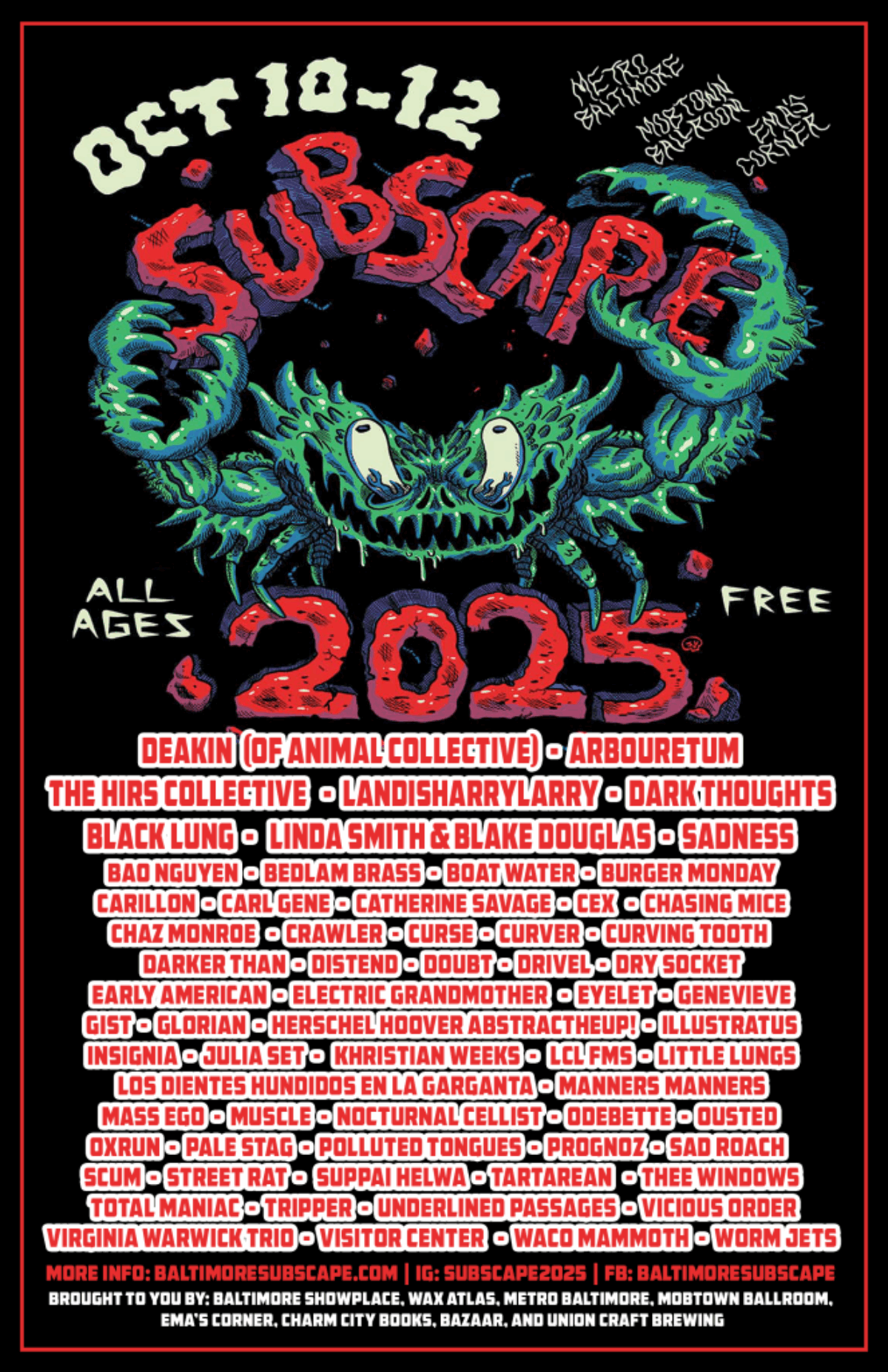 Deakin, The HIRS Collective, Arbouretum, Dark Thoughts, LandisHarryLarry, Black Lung, Sadness, Bao Nguyen, Bedlam Brass, Boat Water, Burger Monday, Carillon, Carl Gene, Catherine Savage, Cex, Chasing Mice, Chaz Monroe, Crawler, Curse, Curver, Curving Tooth, Darker Than, Distend, Doubt, Drivel, Dry Socket, Early American, Electric Grandmother, Eyelet, Genevieve, Gist, Glorian, Herschel Hoover Abstract, HEUP!, Illustratus, Insignia, Julia Set, Khristian Weeks, LCL FMS, Linda Smith & Blake Douglas, Little Lungs, Los dientes hundidos en la garganta, Manners Manners, Mass Ego, Muscle, Nocturnal Cellist, Odebette, Ousted, Oxrun, Pale Stag, Polluted Tongues, Prognoz, Sad Roach, Scum, Street Rat, Suppai Helwa, Tartarean, Thee Windows, Total Maniac, Tripper, Underlined Passages, Vicious Order, Virginia Warwick Trio, Visitor Center, Waco Mammoth, Worm Jets