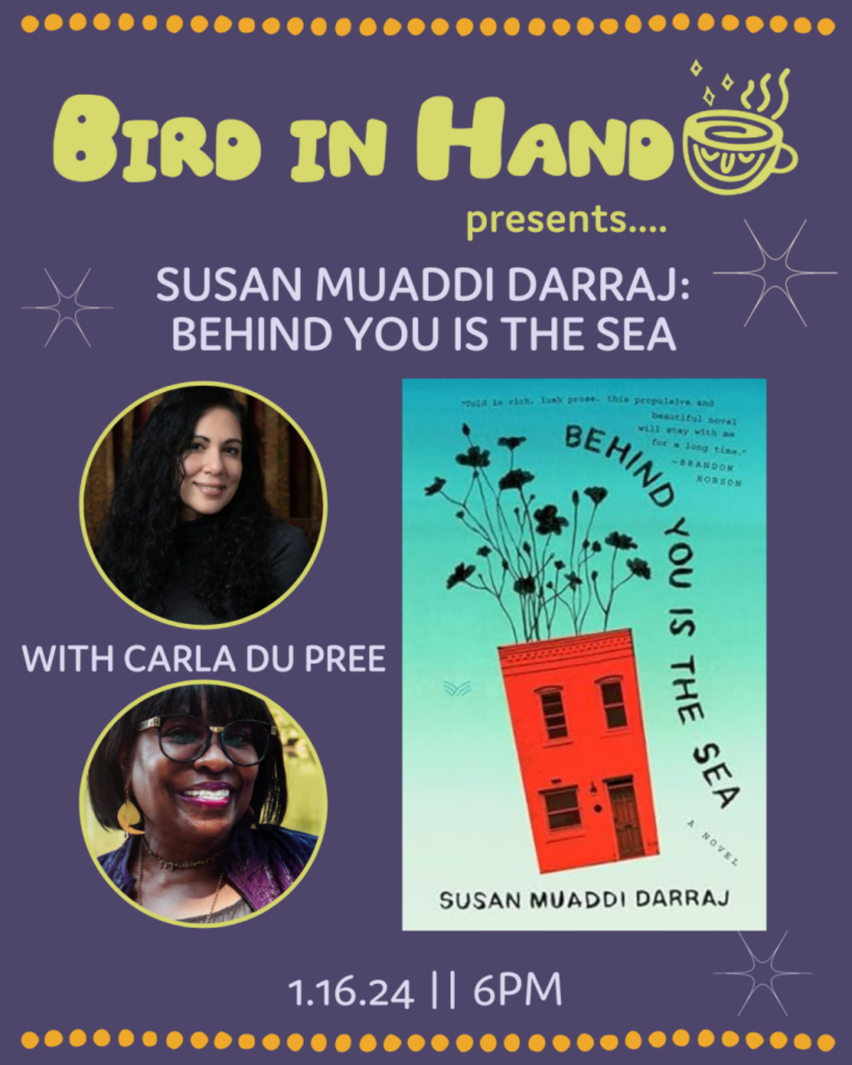 We are thrilled to host award-winning author, Susan Muaddi Darraj, in celebration of her debut novel! BEHIND YOU IS THE SEA gives voice to the diverse residents of a Palestinian American community in Baltimorefrom young activists in conflict with their traditional parents to the poor who clean for the richlives which intersect across divides of class, generation, and religion. We hope you will join us to hear from and discuss what Naomi Shihab Nye calls a “necessary, beautiful work.” We are thrilled that the inimitable literary force Carla Du Pree will join Susan in conversation.