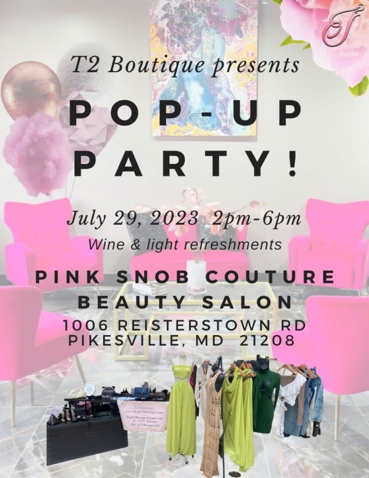 Come join T2 Boutique at Pink Snob Couture Beauty Salon as we host our Summer Pop Up Party! Shop our new arrivals, get 75% off sale items, 50% off swimsuits and enjoy FREE wine and refreshments!