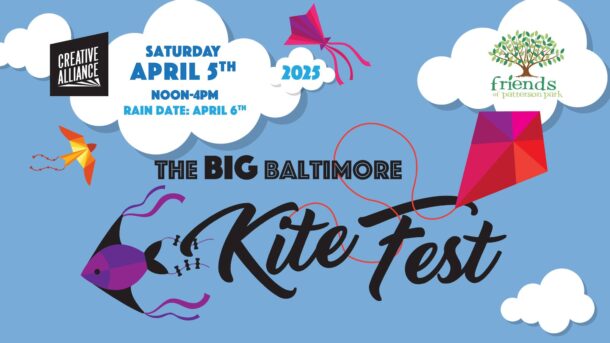 On-site: Friendly Flyer workshop (free), kites for sale at the Creative Alliance Tent, food vendors, pop-up performances throughout the park, professional fly zone, and more!