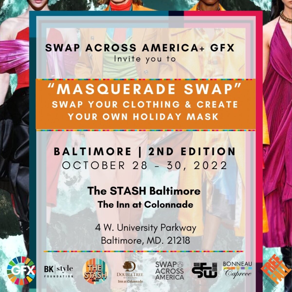 The one October holiday weekend that inspires America to dress-up and have fun is headed our way, and it’s time to get dressed, show up and experience an amazing moment! Mask up any way you want! Slip into your costume, Vintage chic or Wearable Art, and get ready to Wear-It-Out! for Masquerade Weekend celebrating the emerging era of Sustainable Fashion Baltimore and beyond 72-hours straight! Join us opening night, Friday, October 28,2022, 6-9 p.m.!