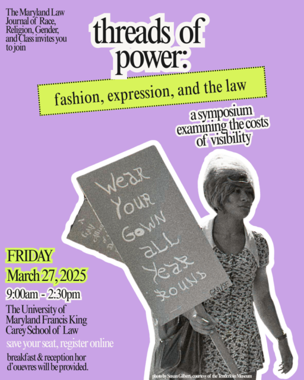 The Journal of Race, Religion, Gender, and Class at the University of Maryland Francis King Carey School of Law is pleased to announce our annual symposium scheduled for March 27, 2026. This year’s symposium is titled, Threads of Power: Fashion, Expression, and the Law.