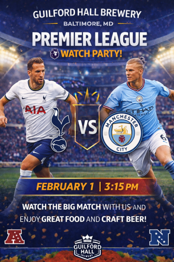 Join us at Guilford Hall Brewery on February 1 at 3:15 PM for a Premier League Watch Party featuring Tottenham vs. Manchester City. Watch the match live on big screens while enjoying great food, craft beer, and a lively match-day atmosphere.