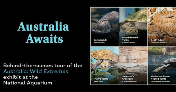 No expensive plane ticket. No 24-hour-long flight. See the animals of Australia right here in our own backyard at the National Aquarium’s Australia: Wild Extremes exhibit. This special behind-the-scenes tour will show us many of the Australian exhibit inhabitants from a different view than we are usually allowed.